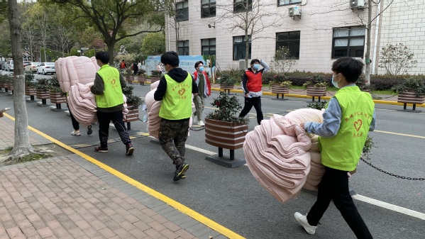 同样,入党积极分子在党组织的带领和号召下积极加入志愿队伍。在校期间,他们迅速集结、有序分工,无论是走读学生入住的农信楼机房还是在宿舍区域,都有“绿马甲”的身影。每日送餐、搬运和发放物资、维持核酸检测队伍秩序、出入人员登记、组织排队洗澡等......无论在哪里,都有他们的身影,“绿马甲”成为疫情防控网格化管理中的一条条细线,密织出疫情防控屏障。