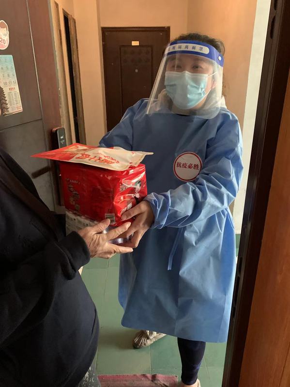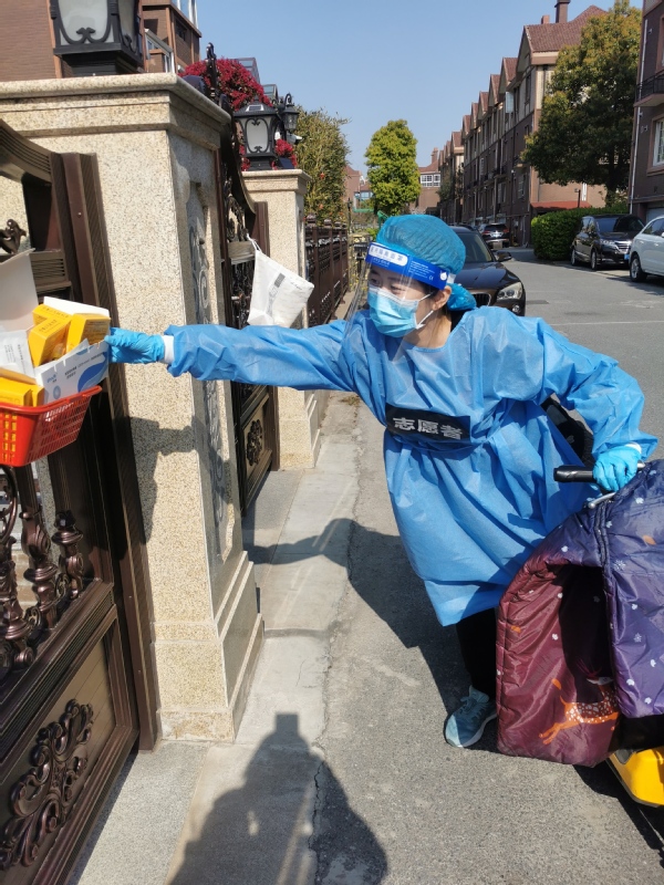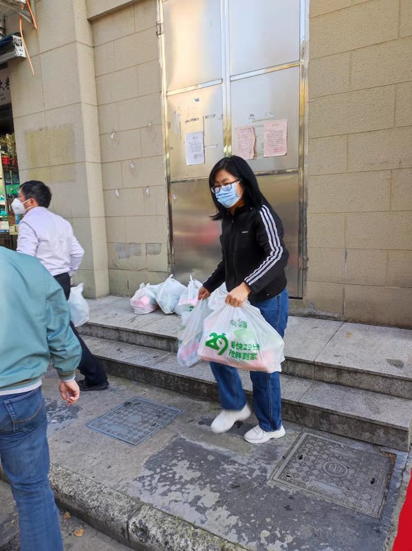 4月1日、4月3日,袁少英老师在居住的广富林街道松云水苑小区参与保障民生物资发放。为了控制人员密度,减少接触,每栋楼只有两名志愿者,志愿者们要负责几十户的物资发放,每户物资包括牛奶、方便面、蔬菜等,一份重十几斤。“作为党员这是应该的,能为大家做点事是最开心的。”
