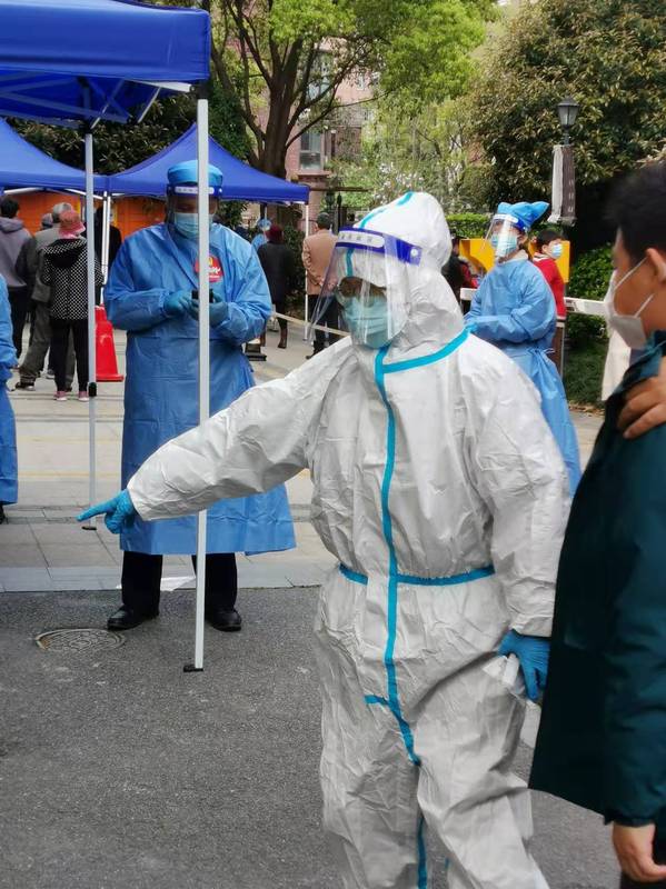 4月1日、2日、4日、5日,蒋文怡老师连续四天参与松江区永丰街道百合苑居民区志愿服务,多次参加社区全员核酸检测辅助工作、社区巡逻监督等工作。“防疫工作,人人有责,能作为志愿者为我的‘家园’做出一些贡献,我感到非常荣幸。”