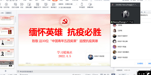 学生党支部书记张婧敏向大家介绍了目前校内外疫情防控形势和此次活动重要意义。学习媛地社负责人徐文颖,带领大家在线学习了33位“中国青年五四奖章”追授抗疫英雄的先进事迹。学习结束,大家结合此次疫情期间的亲身感受进行了交流发言。