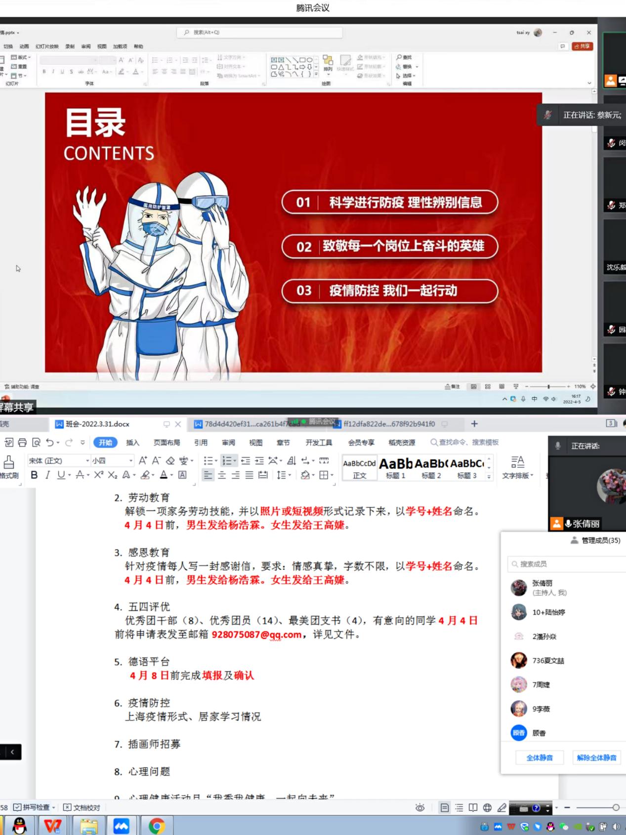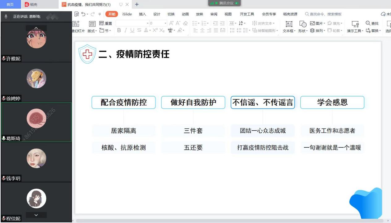 为增强同学们的责任意识和防护意识,班主任向同学们传达了当前上海疫情形势与防控精神以及学校疫情防控相关要求和举措,使同学们意识到形势非常严峻,要安心居家学习,配合社区做好疫情防控工作。同时,科普宣传了新冠病毒防护基本知识,使学生了解到奥密克戎的危害性,引导同学们做好健康防护,正确佩戴口罩,绝不松懈,坚持做好健康每日报,做疫情防控“第一责任人”。呼吁同学们遵纪守法,崇尚科学,通过官方渠道了解疫情信息和防护知识,不信谣、不传谣,共同营造科学防疫、积极应对的抗疫氛围。