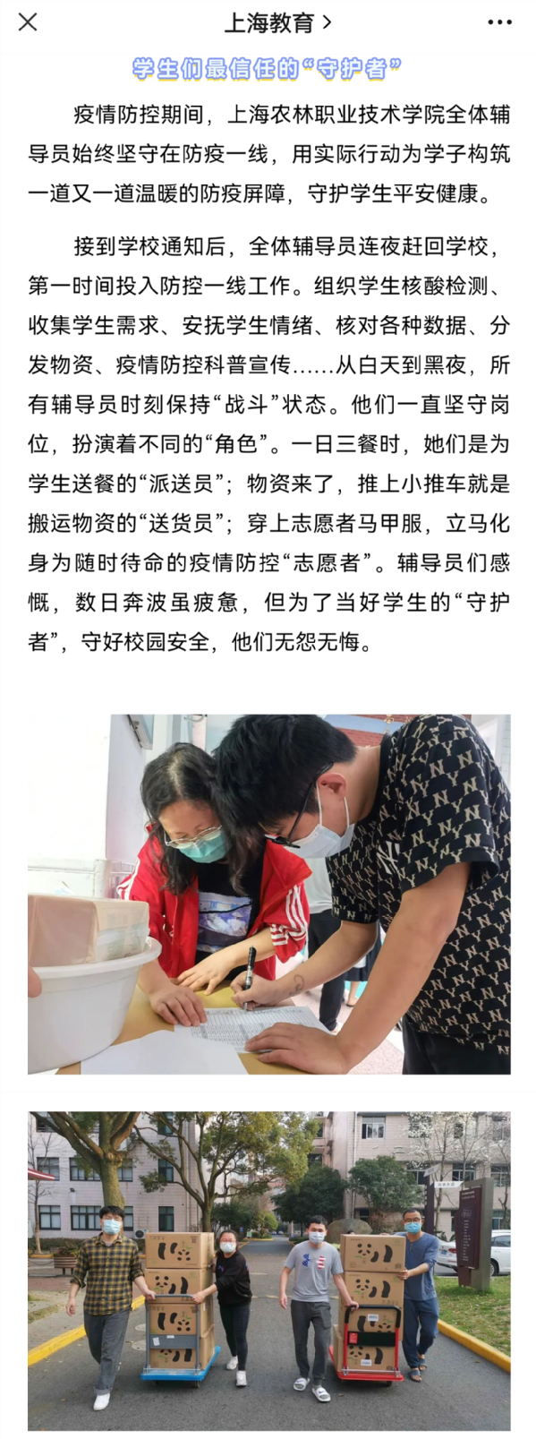 “上海教育”微信公众号推出“战‘疫’时刻,上海高校辅导员全天候守护你”主题系列报道,并于4月7日报道学院辅导员日夜坚守校园防疫一线,守护学生平安健康。