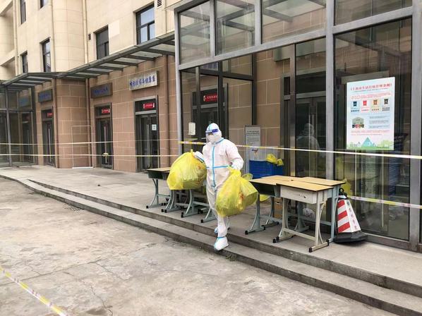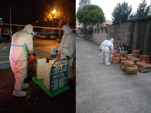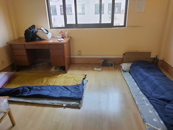 3月中旬的天气,阳光格外给力,日均气温多在20℃以上,防护服密不透风,化身“大白”的安保队员们各个汗如雨下,在防疫物资紧张的当下,他们舍不得多换,一穿就是一个班,再脱下时,身上已散发阵阵浓郁的汗臭味。由于情况紧急,队员们都没来得及准备个人生活物品,换洗衣物成了大难题,队员们平均年龄35岁,均是外省市来沪打工人员,多数无亲属在沪,衣物外来补给几乎不可能,于是,保安队长请其爱人帮忙,从队员们的居所带了一部分衣物送至学校,他们互相拼拼凑凑,熬过了头三天,到第四天开始,队员们已无衣物可穿,大白衣服便是他们的贴身衣服了,但是队员们无怨无悔,总是笑着和每一位碰面的教职员工问好。在被问及为什么不向学校求助时,受访队员哽咽了,他们说:“当时,安排检测点、发放物资……学校所有人都很忙碌,我们怎么好意思再麻烦他们呢?”在最初的几天,他们没有向学校提出一些生活物资需求,工会、保卫部门在得知基本情况后,为大家及时解决了部分基本生活物资。