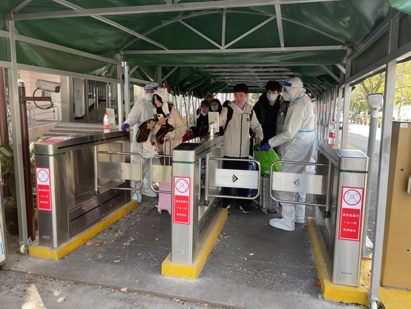 校园14天闭环管理期间,由于学校就一个校门出入口,校门区域事务繁多,除了常规的接收快递,还是一日四餐配送、分拣之地,各种物资卸货、分配之地,家长、家属送个人物资之地,防疫人员、车辆出入必经之地……队员们一遍一遍不厌其烦地登记检查、收警戒线、清洁消毒、恢复警戒线,经常还需做好搬运服务,在师生集中离校、进校时,认真仔细核对离校码、扫健康码,消杀车辆,一个一个细致的举动,保安队员们用实际行动,时刻保卫校园安全。