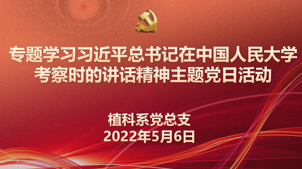 4月25日上午,中共中央总书记、国家主席、中央军委主席习近平到中国人民大学考察调研并发表重要讲话。5月6日,植科系党总支在线上开展主题党日活动,认真深入学习领会习近平总书记重要讲话精神,全体党员参加学习交流。党总支书记高东菊主持会议。