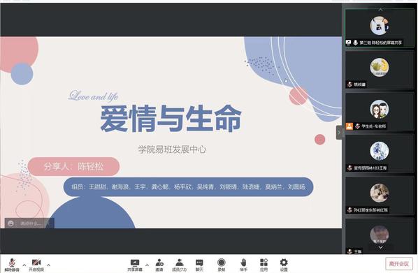 3月31日起,学院易班发展中心在线上开展“易”时代为主题的易班网络建设学习班,共有百余名学生骨干参与,学习内容包含团史学习、高校网络思政工作的思考、新闻写作提升、新媒体时代的易班网络思政、新闻摄影等专题学习。为巩固所学知识,增进同学们之间的沟通交流,5月14日晚,易班组织学生骨干在线上开展学习班分享会。