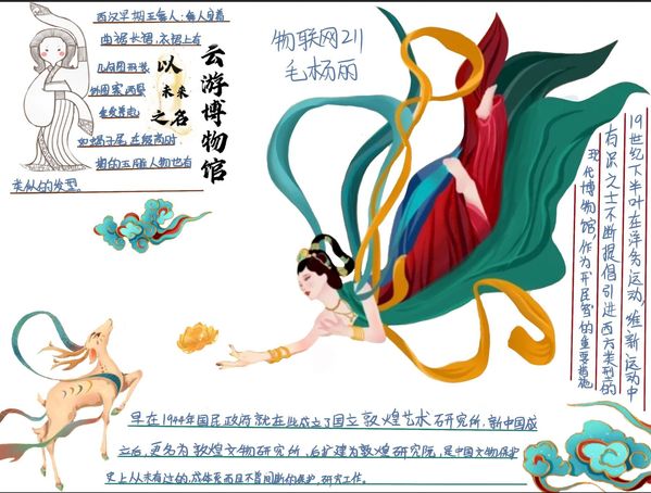 在线下,同学们查阅相关资料,精心设计,绘制出了许多各具特色的手抄报,物联网211班毛杨丽的《飞天》作品尤为出众,画风优美,人物形象具有很强的代表性,是对中国敦煌壁画艺术的赞美与宣传,彰显了大学生对历史文化传承的热爱。