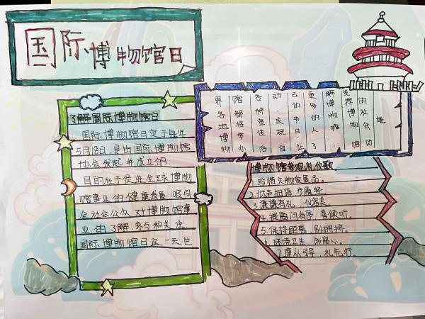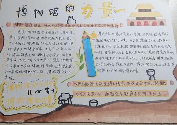 今年的5月18日是第46个国际博物馆日,主题为“博物馆的力量”( The Power of Museums),旨在强调博物馆拥有影响人类世界的巨大潜力和强大能力,呼吁各界共同建设更美好的未来。为加强学生爱国主义教育和对历史文物的保护意识,智工系团总支线上开展“以未来之名,云游博物馆”主题活动,通过在线云看展、绘制手抄报等形式,宣传历史文化和文物知识,传承中华优秀文化,提高文化自信。