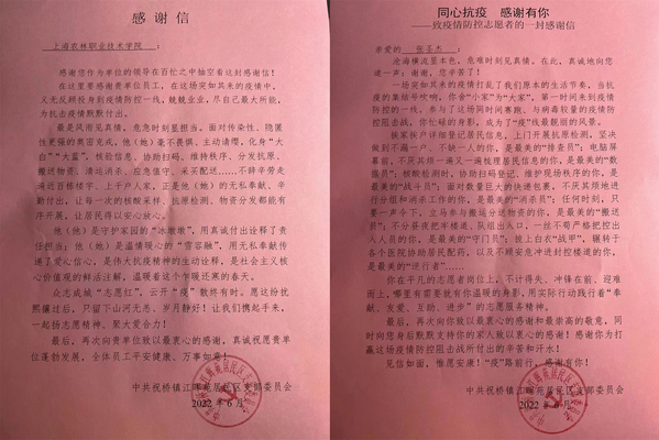 近日,学院收到浦东新区祝桥镇江晖苑居委会的感谢信。信中感谢生物医药与健康系质检191班张圣杰同学对社区防疫工作所做的努力和贡献。