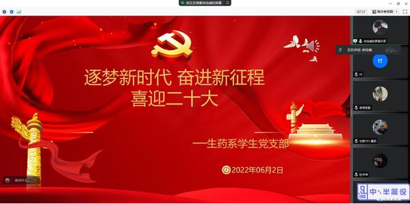 为切实做好毕业生党员离校教育工作,发挥毕业生党员的带头模范作用,提升毕业生党员及入党积极分子的党性修养,6月2日中午,生药系学生党支部在线上开展“逐梦新时代,奋进新征程,喜迎二十大”毕业生党员及入党积极分子主题教育活动。支部书记、组织员、毕业生党员及入党积极分子等20余人参加。