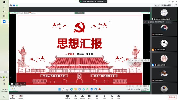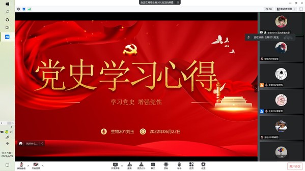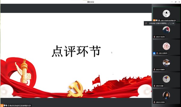 生物202班廖家萍通过视频讲述张桂梅校长即使走不稳路,也要坚持送考,告诉大家要不怕苦,不怕累;不忘初心,砥砺前行。生物201班刘玉则是讲述了学习党史的内容及意义,告诉大家一代人有一代人的使命,要在学习和生活中不断提高自己。质检201班沈士苇认为通过党课学习,可以坚定入党目标,向党靠拢,并通过此次疫情得到了要展开行动,克服困难,帮助他人的感悟。质检201班徐瑾华分享道:“我们通过学习党史,以史为鉴,就可以心中有信仰,脚下有力量,我们要不断强化理论知识,提高自身能力,练就一身过硬本领。”