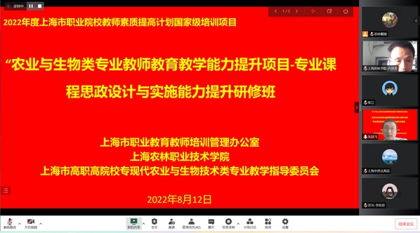 8月12日,由学院承办的2022年度上海市职业院校教师素质提高计划国家级培训项——“农业与生物类专业教师教育教学能力提升项目-专业课程思政设计与实施能力提升研修班”在线上正式开班。上海市师资培训中心高教与职教部副主任朱园飞、学院副院长张江出席开班仪式并讲话,学院人事处、以及来自16所学校的50教师参加开班仪式。学院生物医药与健康系副主任卢洪秀主持开班仪式。