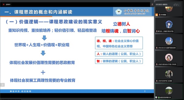 本次培训由上海市教育委员会和上海市师资培训中心指导,是对《高等学校课程思政建设指导纲要》《高校思想政治工作质量提升工程实施纲要》等重要文件精神的深入贯彻,是对全面推进高校课程思政建设、充分挖掘各类课程思政资源、发挥好每门课程的育人作用、全面提高高职院校教师课程思政设计和实施能力的落实。