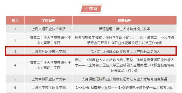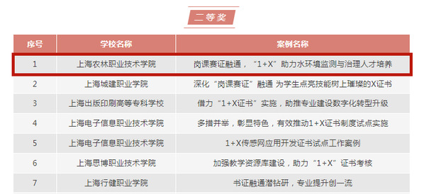此次,上海市职业院校1+X证书制度试点专家委员会征集78个1+X证书制度试点典型案例。经专家遴选、专委会审定等流程,评选出43个优秀案例,含一等奖9个、二等奖15个、三等奖19个。
