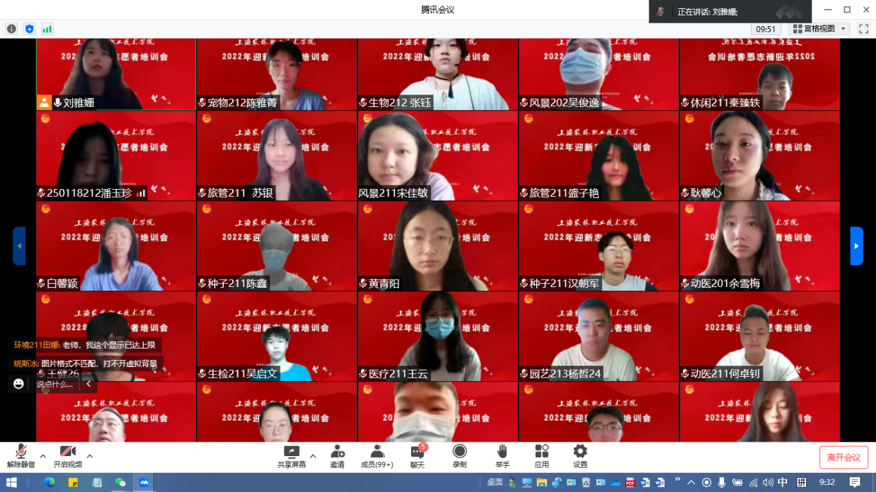 为做好开学迎新工作,9月7日上午,院团委在线召开迎新志愿者培训会。团委负责人、志愿者工作负责老师及90余名院团委、易班及各系部迎新志愿者共同参与。