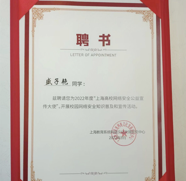 9月8日上午,2022年国家网络安全宣传周上海地区“校园日”活动在上海交通大学钱学森图书馆举行。学院新换届易班学生工作站负责人旅管211班盛子艳同学参加了该活动,并被授予“网络安全公益宣传大使”,全市高校仅10名学生获此殊荣。