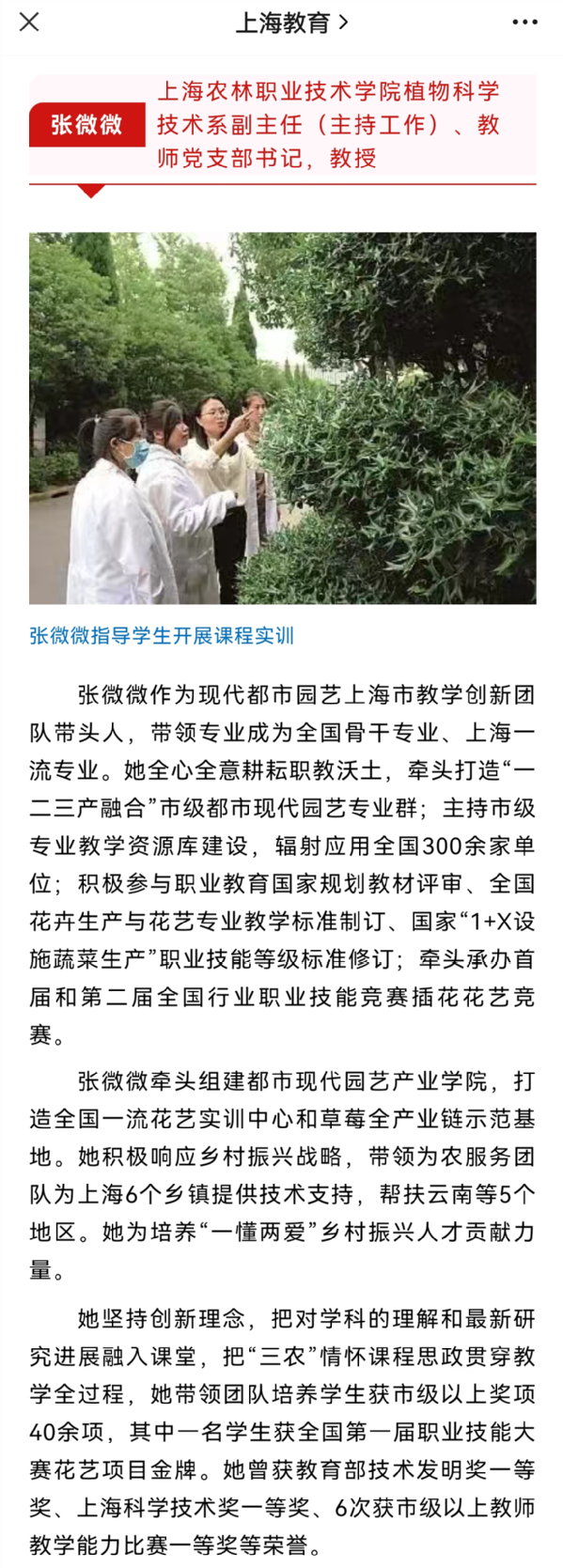 上海教育:张微微:上海农林职业技术学院植物科学技术系副主任(主持工作)、教师党支部书记,教授