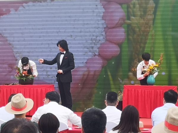 开幕式上,植科系两位插花小将现场进行中国传统插花表演,伴随着水稻之父袁隆平作词的一首《我有一个梦》,农民的梦想与希望伴随着歌手委婉的歌声娓娓道来,丰收的稻谷在插花作品中运用的惟妙惟肖,表现了秋收、农作物随风摇曳的场景,体现了农耕农趣农味的文化。活动现场设置的农产品集市上,学院的展位陈列着精美的压花项链、扇子等工艺品、学院的绿色认证大米、基地的草莓苗等农副产品,吸引了很多人的驻足。