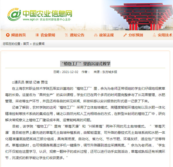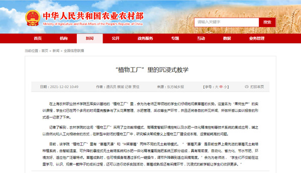 12月2日,农业农村部、农业信息网报道了学院“植物工厂”里的沉浸式教学。全文如下: