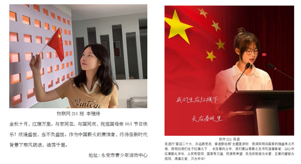 活动得到同学们的积极响应。在“我与国旗合个影”活动中,有学生在家中将国旗举于胸前表达与祖国心连心,也有通过打卡红色景点缅怀英雄,还有运用专业知识设计爱国海报......“我们生在红旗下,长在春风里,人民有信仰,国家有希望,目光所至皆为华夏,五星闪耀皆为信仰。何其有幸生于华夏,愿山河无恙,祖国繁荣昌盛!”朗朗祝福传达出学生们浓厚强烈的爱国情怀。在“祝福送祖国”活动中,同学们通过歌舞、绘画、告白信、宣传海报、打卡红色基地等形式,抒发对祖国繁荣昌盛的美好祝愿,展示了一幅幅盛世华诞的美好愿景。在这举国同庆的节日里,团员青年们作为担当民族复兴大任的时代新人,以实际行动诠释请党放心、强国有我的真挚情感。