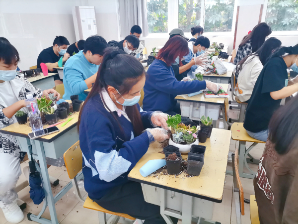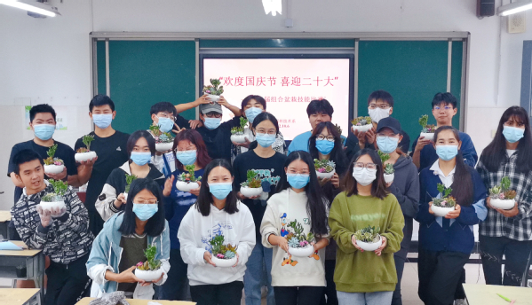 10月6日,在一教109教室,园林系开展“欢度国庆 喜迎二十大”之组合盆栽体验活动。