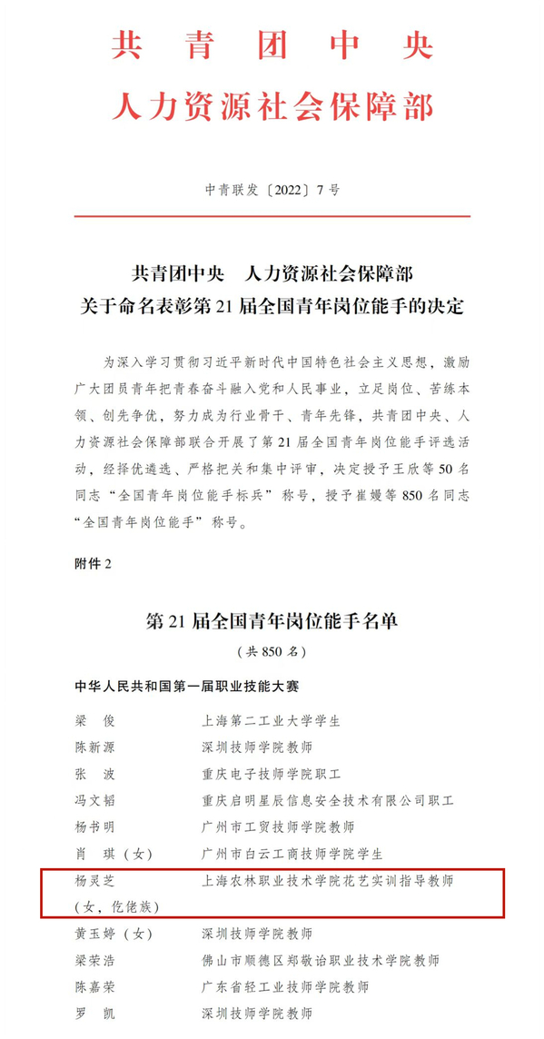 为充分发挥青年典型模范带头作用,激励广大团员青年立足岗位、苦练本领、创先争优,努力成为行业骨干、青年先锋,共青团中央、人力资源社会保障部联合开展第21届全国青年岗位能手评选活动,并于近日联合印发《关于命名表彰第21届全国青年岗位能手的决定》。植科系杨灵芝老师成功入选,荣获“第21届全国青年岗位能手”荣誉称号。
