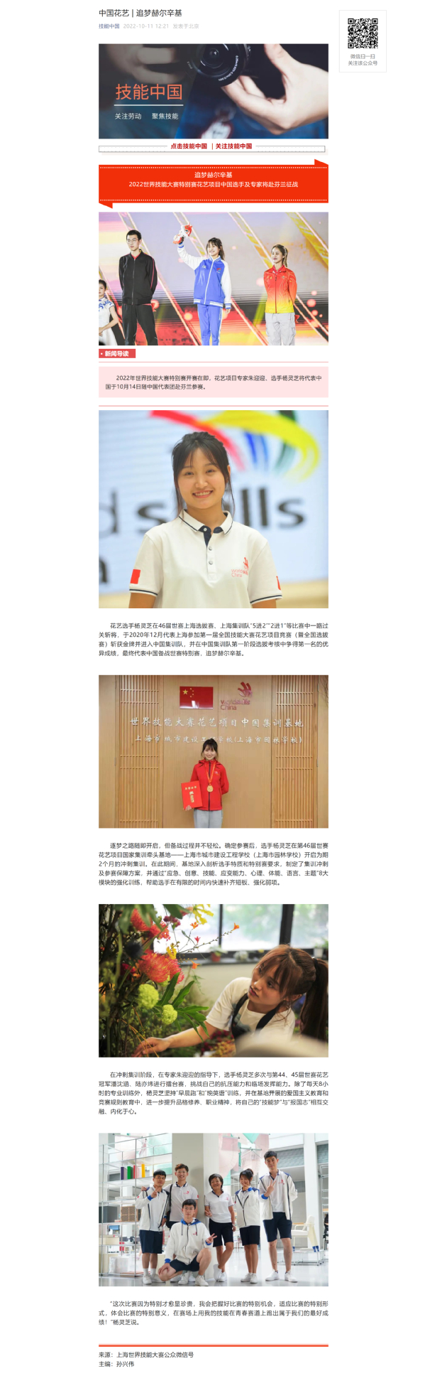 10月11日,“技能中国”公众号以“中国花艺 | 追梦赫尔辛基”为题,对2022年世界技能大赛特别赛花艺项目中国选手杨灵芝进行了专题报道,一起来看看吧。