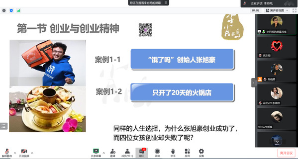 李肖鸣教授凭借自己在创新创业教育项目方面积累的经验和丰富阅历,以创业、创业精神与人生发展为第一篇章,围绕着创业与创业精神、知识经济发展与创业、创业与职业生涯发展、创业与自我认识四个方面进行了详细讲解,明确表示大学生创业应该要具备坚韧、奋斗的创业精神,创业信念要坚定,时刻不能忘记自己的创业梦想,以创业梦想去驱动创业的行动,为实现创业梦想付出持之以恒的努力。她用“饿了么”“只开了20天的火锅店”及各类大赛金奖项目等大量鲜活的创新创业实例,详细解读了什么是创新、创新技术、创新理念,入木三分的将理论与实践结合起来,为师生们深刻而详实的展现了新时代创业梦的可实践性与现实性。