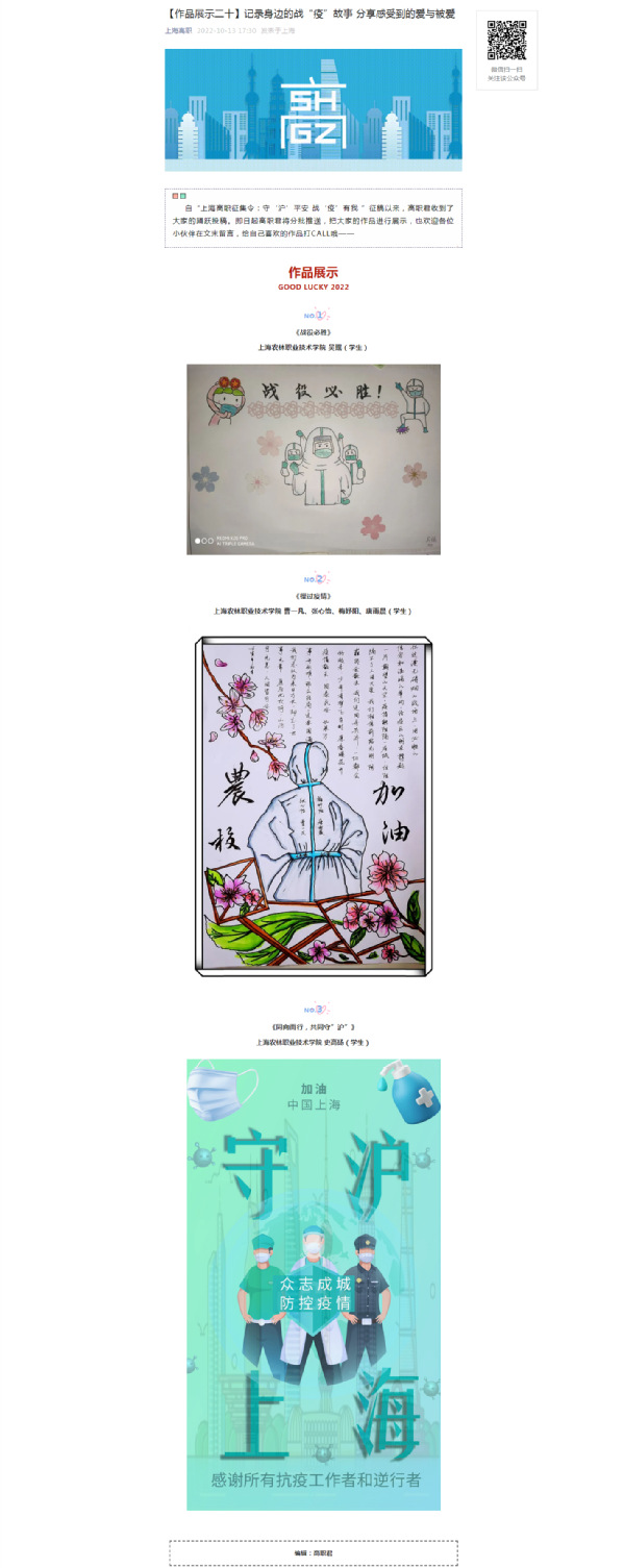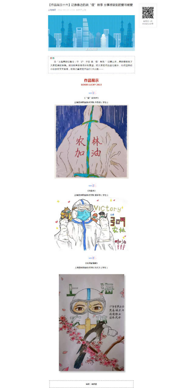 自“上海高职”发布守‘沪’平安 战‘疫’有我 ”征稿以来,上农学子积极投稿,用自创的手绘作品记录身边的战“疫”故事,点赞抗疫一线人员,分享感受到的爱与被爱。
