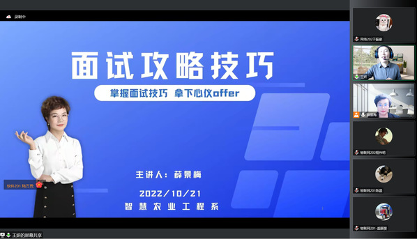 为疏解就业痛点,打通就业难点,帮助毕业生破解就业难题,实现高质量就业,智工系开展《就业赋能,“职”面未来》系列活动,用心护航2023届毕业生求职之路。10月21日下午,智工系邀请人力资源实战专家薛景梅老师在线上开展面试攻略技巧讲座,引导学生提升自身就业核心竞争力。毕业班辅导员和2023届毕业生参加。讲座由智工系副主任王妍老师主持。
