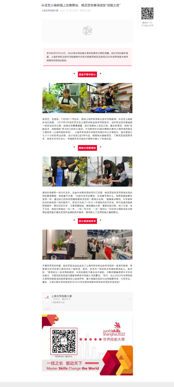 10月28日,“上海世界技能大赛”公众号以“从花艺小萌新踏上世赛舞台,杨灵芝在赛场绽放‘技能之花’”为题,对2022年世界技能大赛特别赛花艺项目获奖选手杨灵芝进行了专题报道,一起来看看吧。