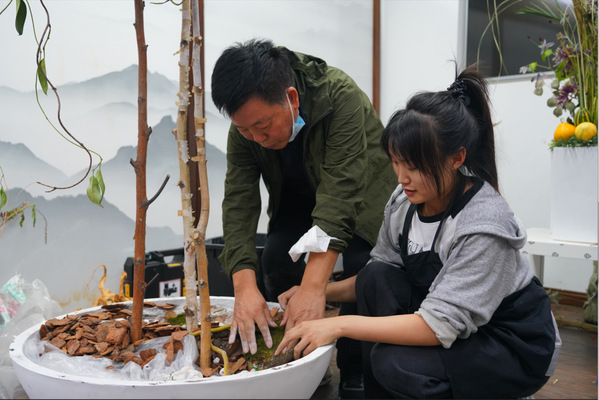 通常女孩都有一双纤纤玉手,但由于长期和花枝花杆打交道,杨灵芝的双手同其他女孩的相比略显粗糙,她却毫不在意:“比起对花艺的着迷,这些都不算什么。我希望能够像朱老师一样,通过自己的双手把植物最有灵性的一面展示出来。”备赛集训期间,在专家朱迎迎和教练项一鸣的指导下,杨灵芝完成了一件又一件精致的花艺作品,而作品背后既要有编细叶、裁红花的巧手,又要有锯粗枝、搬重器的力量,需要反复训练,做了又做,改了又改,她就在琢磨这一花一木、一枝一叶之间,一步一脚印从一位花艺小萌新成长为获得全国技能大赛花艺项目金牌的技术能手,最终踏上了世界技能大赛的舞台。