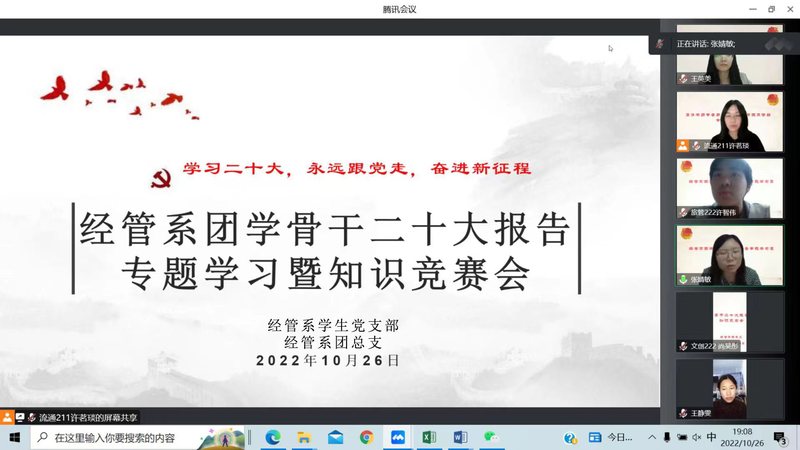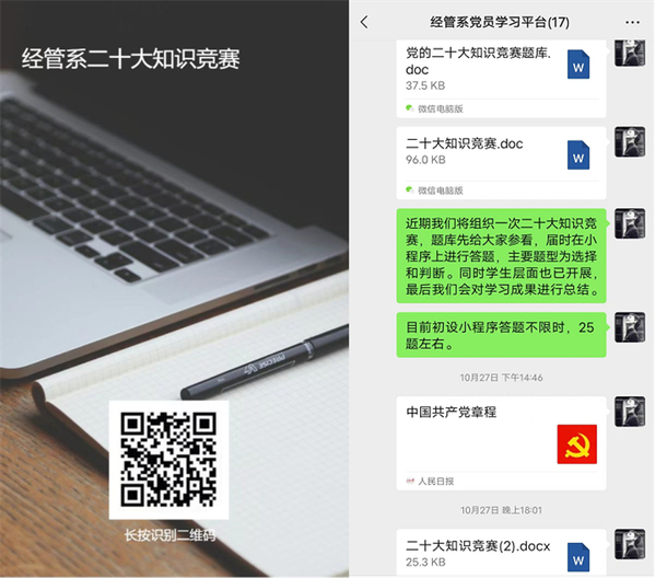 为认真学习宣传贯彻党的二十大精神,践行社会主义核心价值观教育,引领青年学生以昂扬奋斗姿态争做时代新人,10月26日-30日,经管系党总支充分发挥党建引领作用,以党建带团建形式,开展学习党的二十大精神知识竞赛活动,全体党员教师、学生骨干以及学生理论社团近70余名师生共同参与。