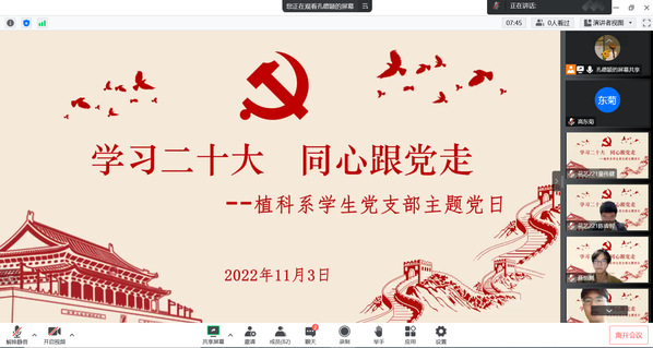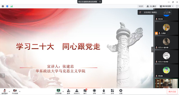 为深入学习贯彻党的二十大精神,引导师生坚定信念,主动担当作为,11月3日晚,植科系学生党支部开展“学习二十大 同心跟党走”线上主题党日活动,专题学习党的二十大报告。活动邀请了华东政法大学马克思主义学院教研室主任张建忠副教授深入解读党的二十大报告。支部全体党员、入党积极分子、团学干部、党建带团建结对团支部学生共计84人参加学习。
