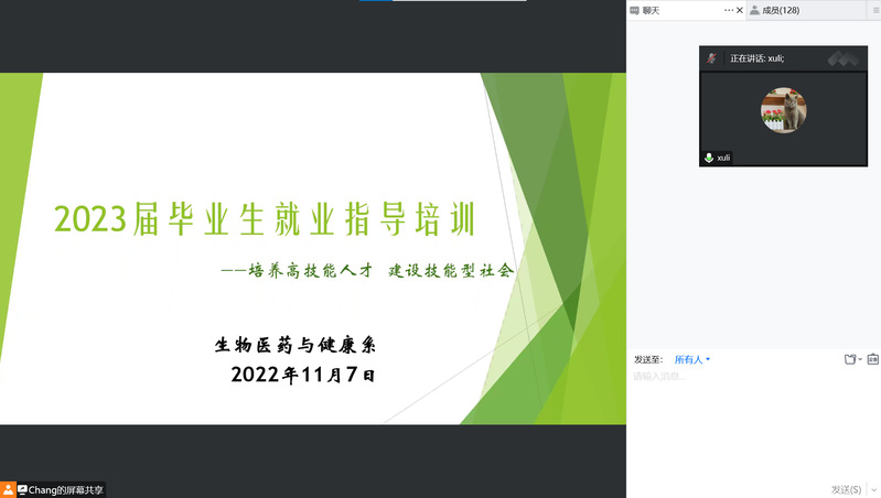为帮助毕业生树立正确的就业观念,提升毕业生的就业能力,11月7日,生物医药与健康系邀请上海医药行业协会副秘书长陈莉为学生作了“培养高技能人才 建设技能型社会”的线上主题讲座,生药系副主任徐莉、辅导员和全体2023届毕业生共同参与。