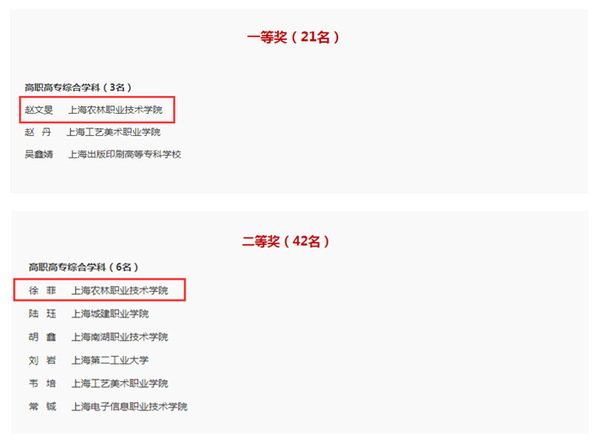 11月7日-13日,上海市教育工会公示了第五届上海高校青年教师教学竞赛暨第六届全国高校青年教师教学竞赛选拔赛获奖名单,学院三名教师获奖,其中,智工系赵文旻老师荣获高职高专综合学科一等奖,植科系徐菲老师荣获高职高专综合学科二等奖、马院王欢欢老师荣获思想政治理论课专项三等奖。