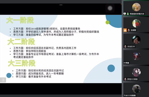 2021届旅游管理专业优秀毕业生党员韩提提向大家详细讲述了大学三年从申请入党到成为预备党员过程中,党组织对自己的鞭策与鼓舞,使自己在思想、学业、工作能力、综合素质等方面取得显著成长,分享了自己备考上海师范大学旅游管理专业全日制专升本过程中的经验教训。同时她建议学弟学妹们,大一进校后一定要有清晰的生涯规划,朝着目标,一步一个脚印的向前迈进。2022届农业经理管理专业191班毕业生张雯倩现就读于上海建桥学院会计学专业,她向大家分享了自己总结出的学习五要素:端正的态度、积极的心态、科学的方法、明确的目标和适当的借鉴,着重介绍了民办院校全日制专升本的免笔试面试录取申请条件,以及未取得计算机一级证书情况下的加试科目等。