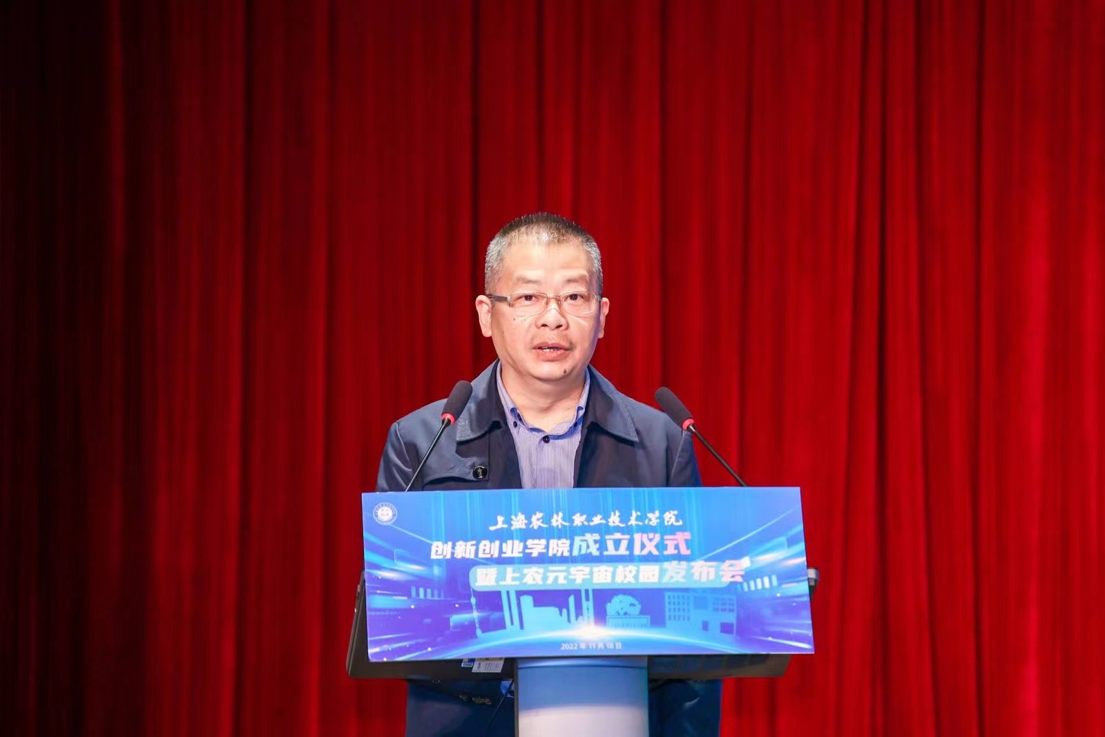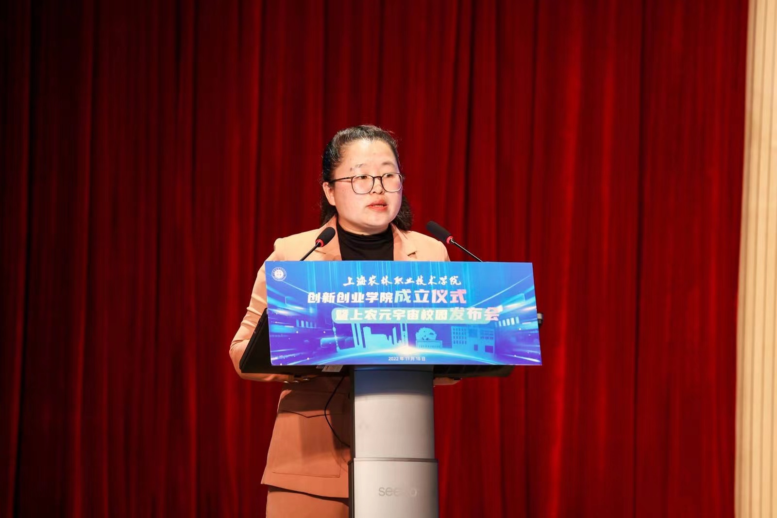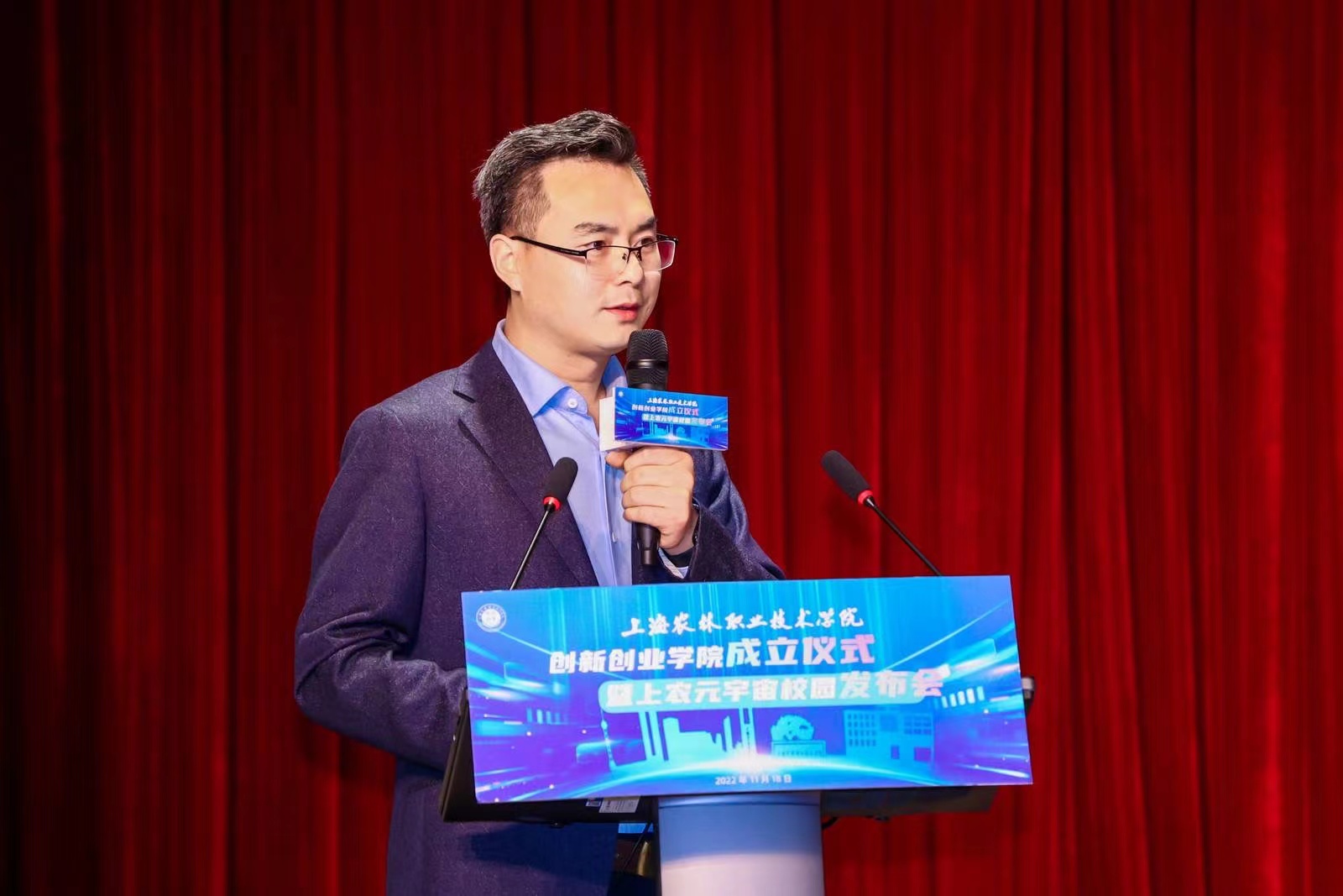 11月18日,在205报告厅,学校举行创新创业学院成立仪式暨上农元宇宙校园发布会,上海市学生事务中心副主任王涛,上海出版印刷高等专科学校党委副书记顾凯,上海城建职业学院党委委员、副院长郭洪涛,上海电子信息职业技术学院副院长方林中,长三角G60科创走廊联席办科创组组长、松江区科创发展办副主任宋苏伟,松江区人社局副局长马守亮,共青团松江区委员会副书记(主持工作)吕明远,上海市就业促进中心创业指导处创业培训科科长王婉芳,上海市高等教育学会高职高专创业教育专业委员会秘书长宋柏红,上海市学生事务中心双创服务部副部长宋琦,松江区就业促进中心副主任彭晓镝以及来自10余所兄弟院校双创工作负责人,校外双创导师代表,孵化企业代表,人民网、青年报等媒体记者和我校党政班子,相关职能部门负责人,党总支书记,团总支书记,双创导师代表,学生代表等参加成立仪式。党委副书记、副院长邵阳主持成立仪式。