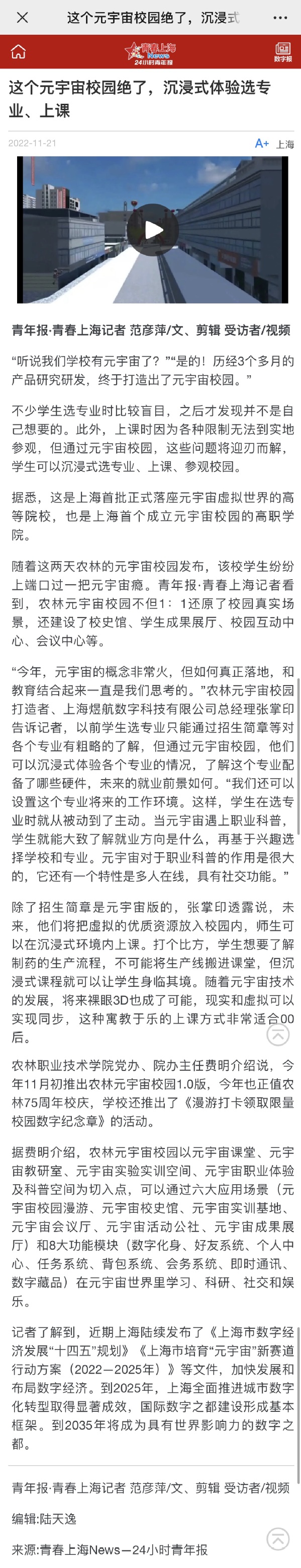 11月20日、21日,青春松江、青春上海News——24小时青年报报道学院元宇宙校园发布。