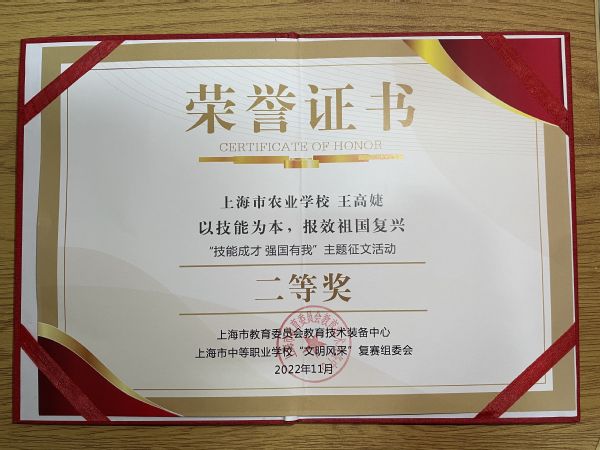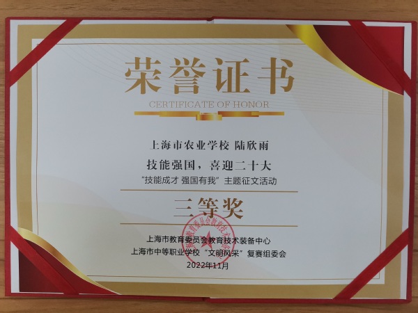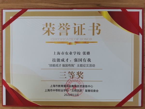 近日,由上海市教育委员会教育技术装备中心和上海市中等职业学校图书馆协会联合举办的“技能成才 强国有我”主题征文活动获奖名单公布,中职园林201班王高婕同学的《以技能为本,报效祖国复兴》获得二等奖、动医212班张璐同学的《技能成才,强国有我》和动医221班陆欣雨同学的《技能强国,喜迎二十大》获得三等奖。