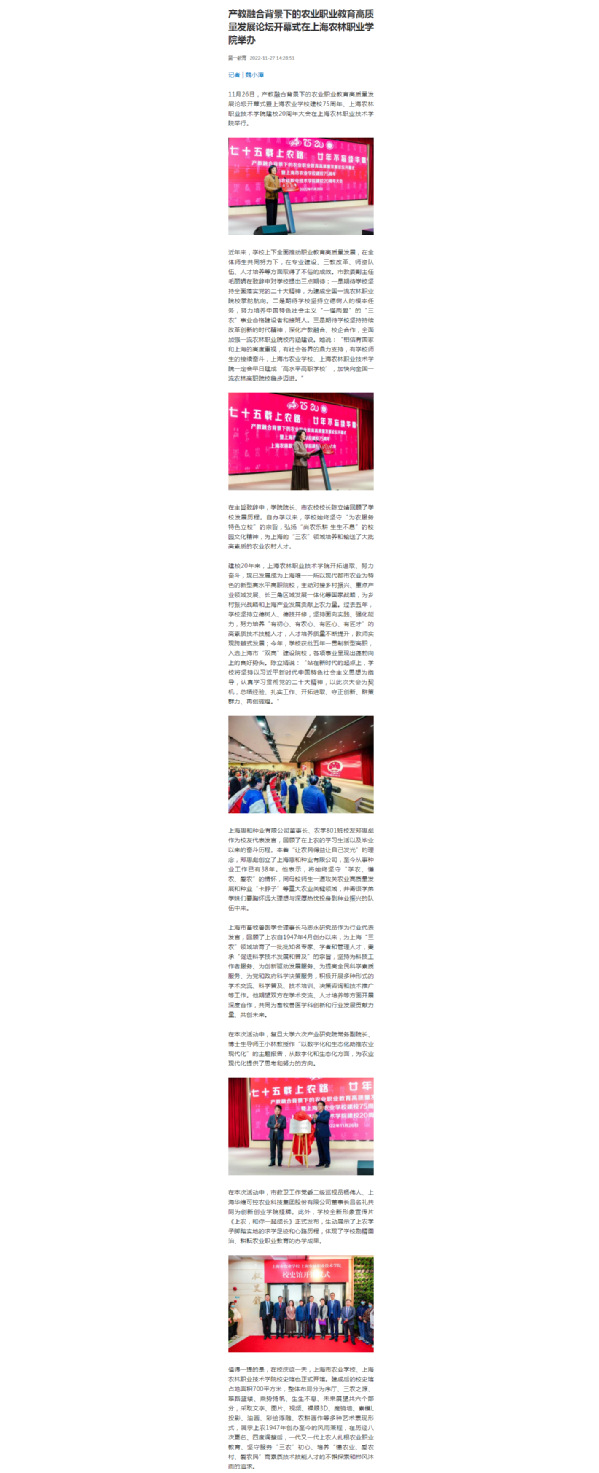 11月26日,产教融合背景下的农业职业教育高质量发展论坛开幕式暨上海农业学校建校75周年、上海农林职业技术学院建校20周年大会在上海农林职业技术学院举行。
