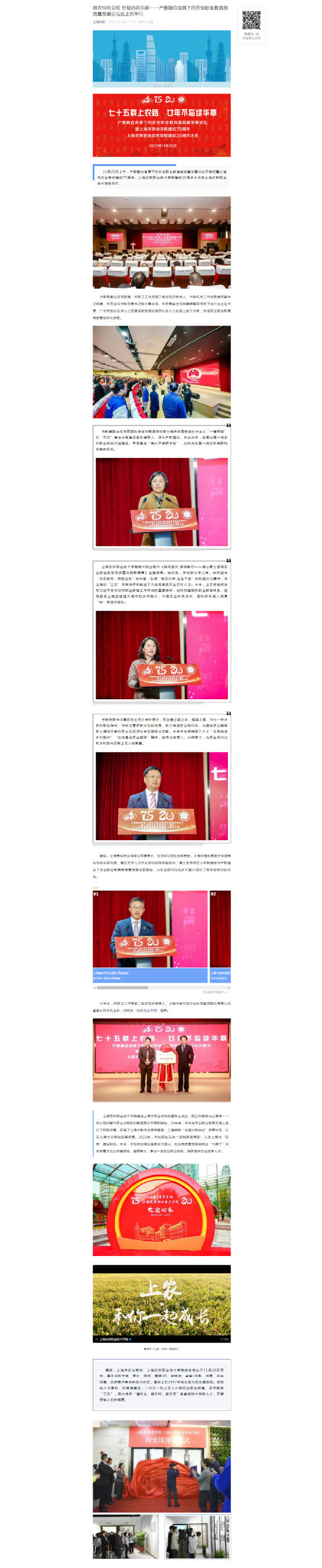 11月29日,“上海高职”公众号报道学校举行产教融合背景下的农业职业教育高质量发展论坛及校史馆开馆。