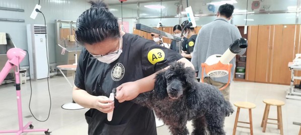 考核分为理论考核(30%)和实操考核(70%)两部分,理论考核以机考形式进行,实操考核分假毛修剪(干区)和犬只洗护(湿区)两部分内容。32名学生分为八组,在考评员严格考评下,历时近6个小时,32名学生全部通过考核。