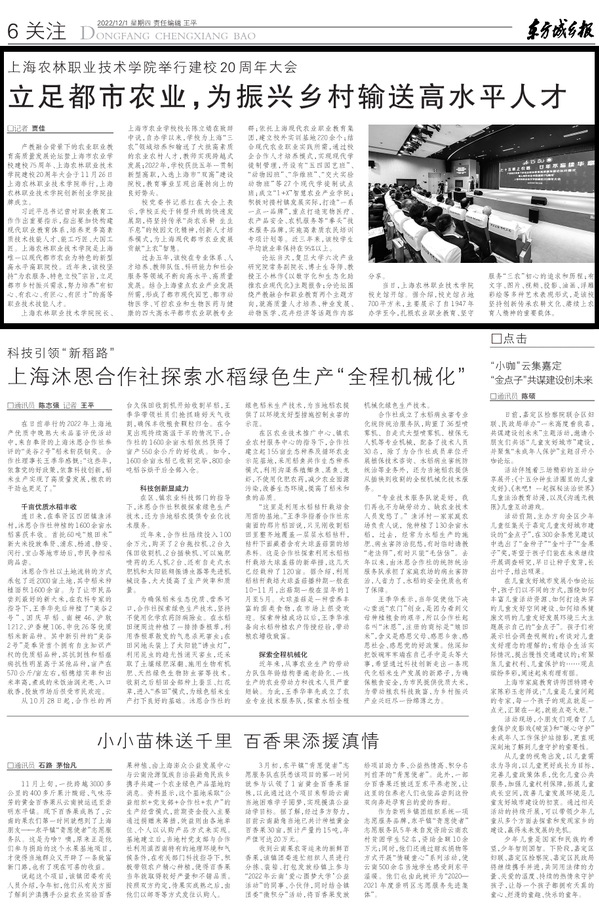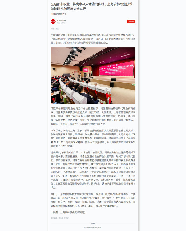12月1日,东方城乡报第六版报道学校举行建校20周年大会系列活动,学校扎根农业职业教育,坚持“为农服务、特色立校”办学宗旨,立足都市乡村振兴需求,努力培养“有初心、有农心、有匠心、有匠才”的高等职业技术技能人才。