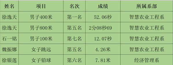 上海市第十七届运动会田径比赛(高校组)于12月3日至4日在上海交通大学附属中学嘉定分校举行,本次市运动会田径比赛共有来自本市33所高校722名运动员参加,学院学子共参加了此次田径赛15个项目的角逐,在强手如云的比赛中,上农学子披荆斩棘,荣获金牌(第一名)一枚,以及取得两个第五名、一个第六名和一个第七名的佳绩。