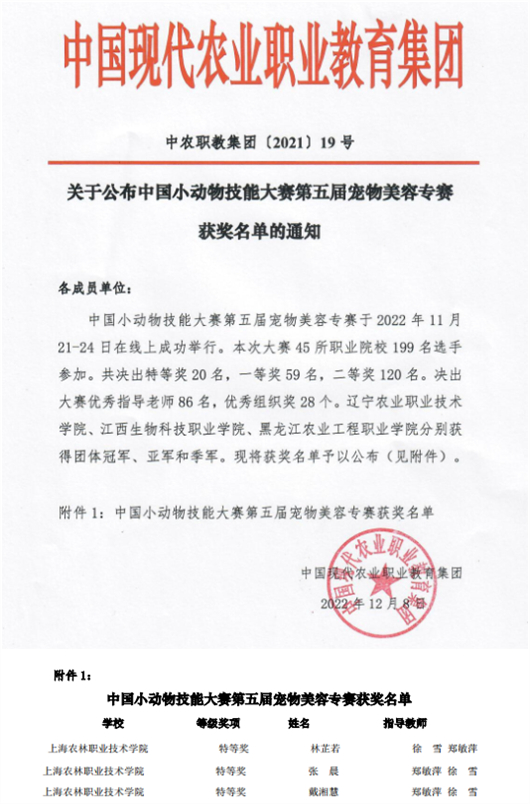 中国小动物技能大赛第五届宠物美容专赛于11月21日至24日在线上举行,由全国农业职业教育教学指导委员会、中国兽医协会指导,中国现代农业职教集团主办,全国48所职业院校的209名选手参加此次大赛。12月9日,比赛获奖名单公布,动科系三位参赛选手获个人特等奖,学院获“优秀组织奖”。