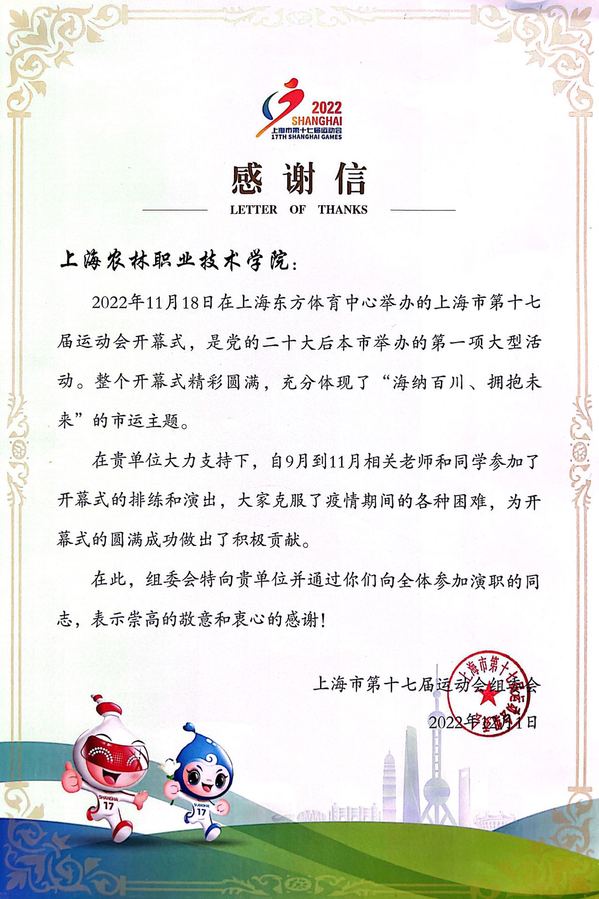 近日,学校收到了上海市第十七届运动会组委会发来的感谢信,对相关老师和同学克服疫情困难,参加开幕式的排练和演出的大力支持表示诚挚谢意。