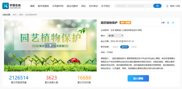 《园艺植物保护》课程2010年入选上海市精品课程,入选2021年上海市精品在线开放课程,2022年入选农业农村部首届涉农职业院校服务乡村振兴“名师名课”项目。《园艺植物保护》是园艺技术专业核心课程,对接上海都市现代园艺人才需要,结合学院尚农乐耕 、为农服务的办学定位及专业目标而开设。课程面向园艺生产农技员、农作物植保员等职业岗位,旨在使学生具备植物病虫害防治基本知识和理论,能够进行病虫害识别诊断、调查测报、综合防治等植保实施,筑牢践行“绿色植保、公共植保、科技植保”新理念的农业可持续发展意识,以“守初心、铸农心、强匠心”引导学生扎根“三农”,成为用植保知识和技能为乡村振兴和产业兴旺保驾护航的新农人。