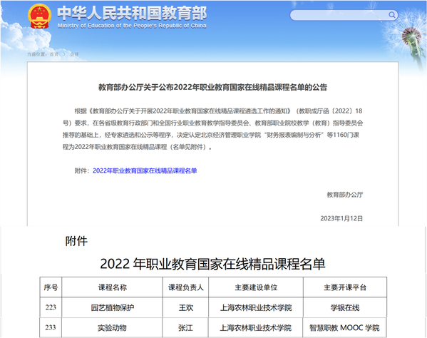日前,教育部发布《教育部办公厅关于公布2022年职业教育国家在线精品课程名单的公告》,确定了1160门职业教育国家在线精品课程。学院《实验动物》《园艺植物保护》两门课程成功入选国家级在线精品课程,实现了学院教学改革与课程建设的新突破。