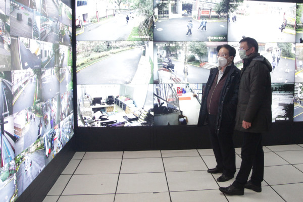 杨伟人一行实地检查了保卫监控值班室、防疫物资储备室、学生食堂等场所,详细了解校园的监控系统、物资储备以及学生食堂运行情况。